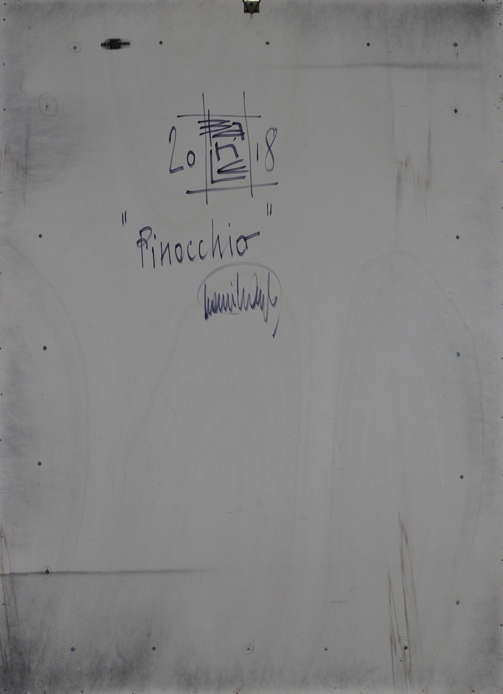 ANGELO BARILE Pinocchio Olio su tavola Anno 2018 Dim. 100x70 Autentica su foto dell'artista Al verso data, titolo e firma