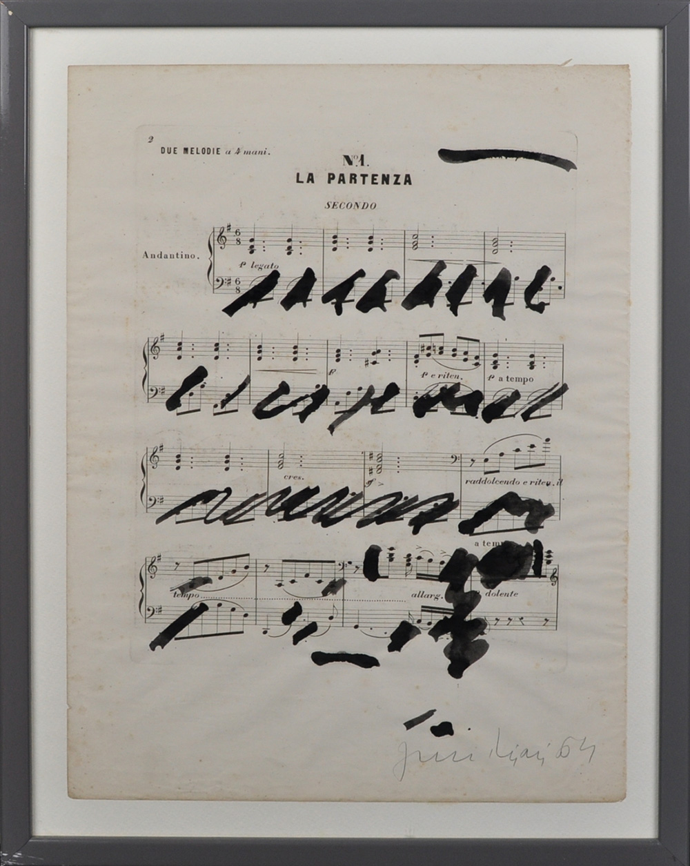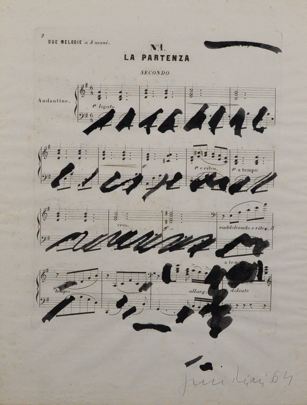GIUSEPPE CHIARI Senza titolo Tecnica mista su spartito musicale Anni 60 Dim. 35x26 Opera pubblicata su “Giuseppe Chiari – Musica madre” Firmato in basso