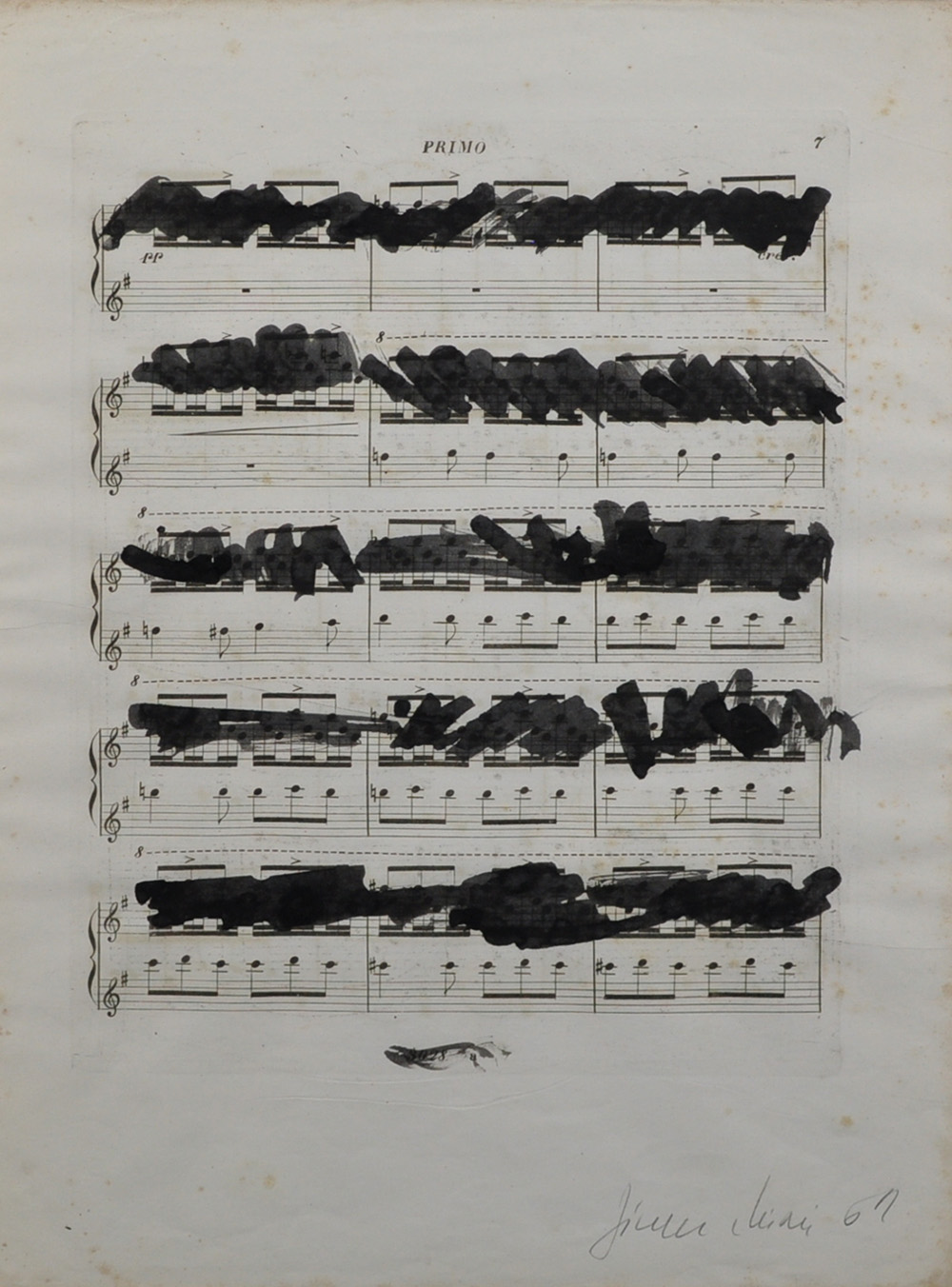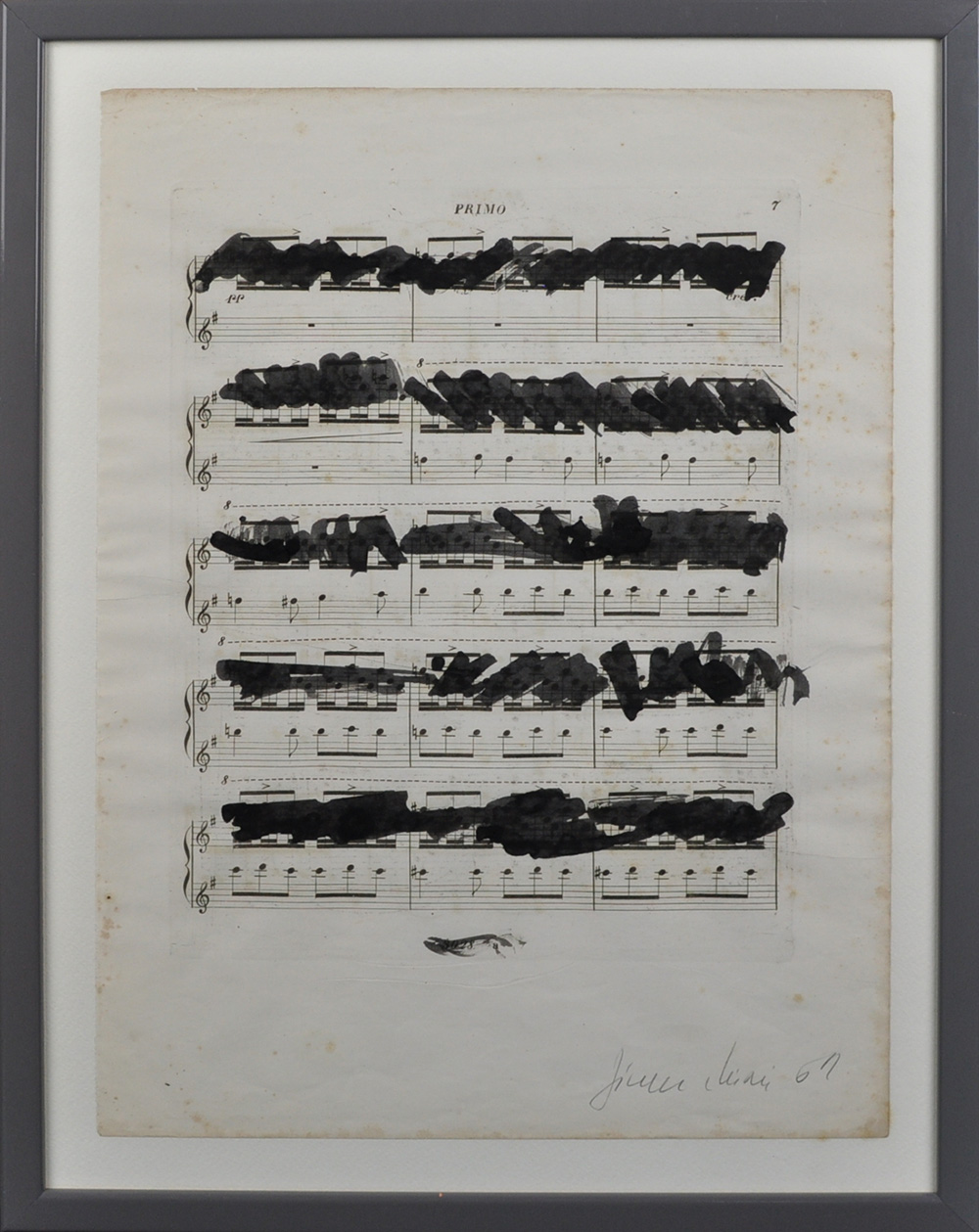 GIUSEPPE CHIARI Senza titolo Tecnica mista su spartito musicale Anni 60 Dim. 35x26 Opera pubblicata su “Giuseppe Chiari – Musica madre” Firmato in basso