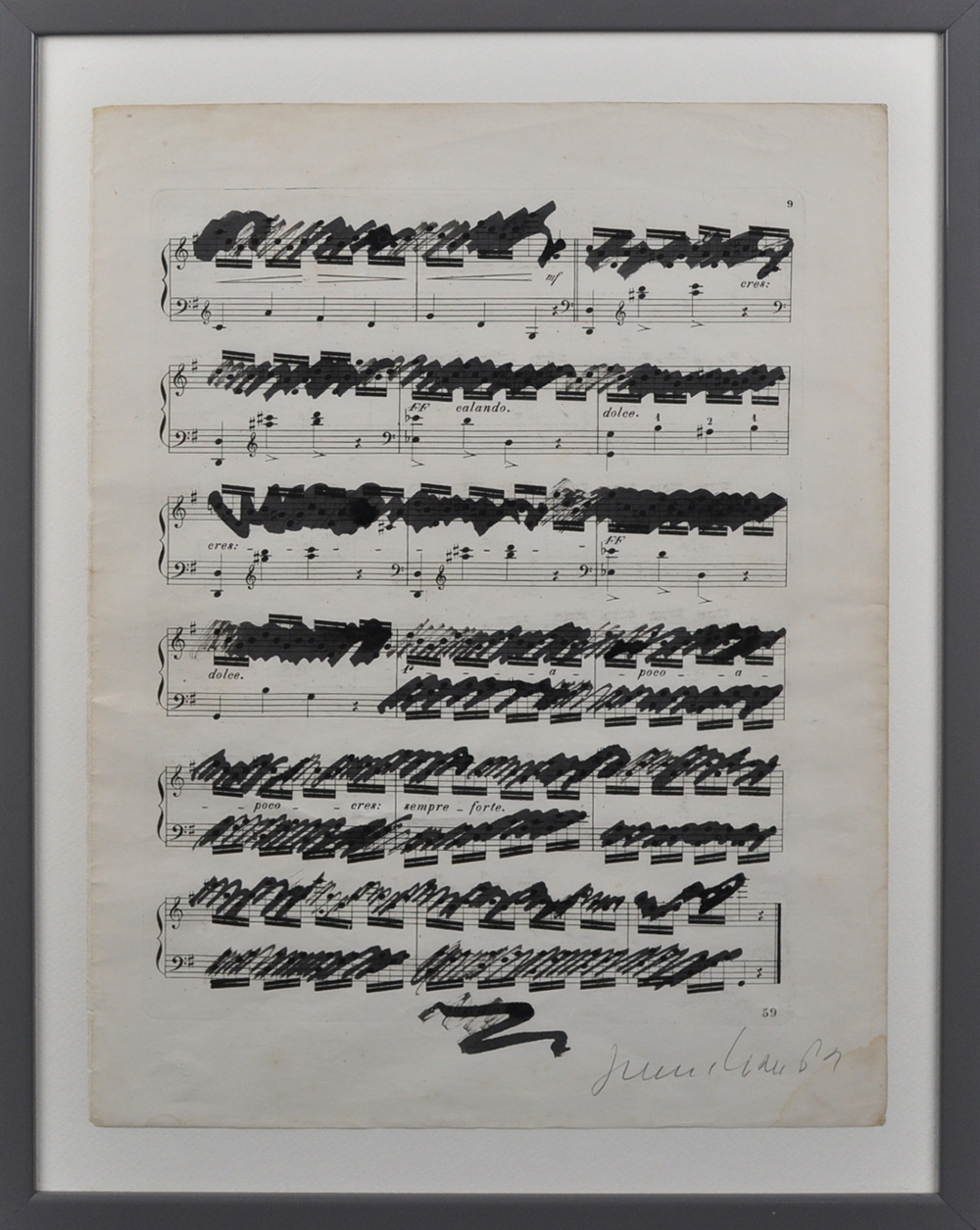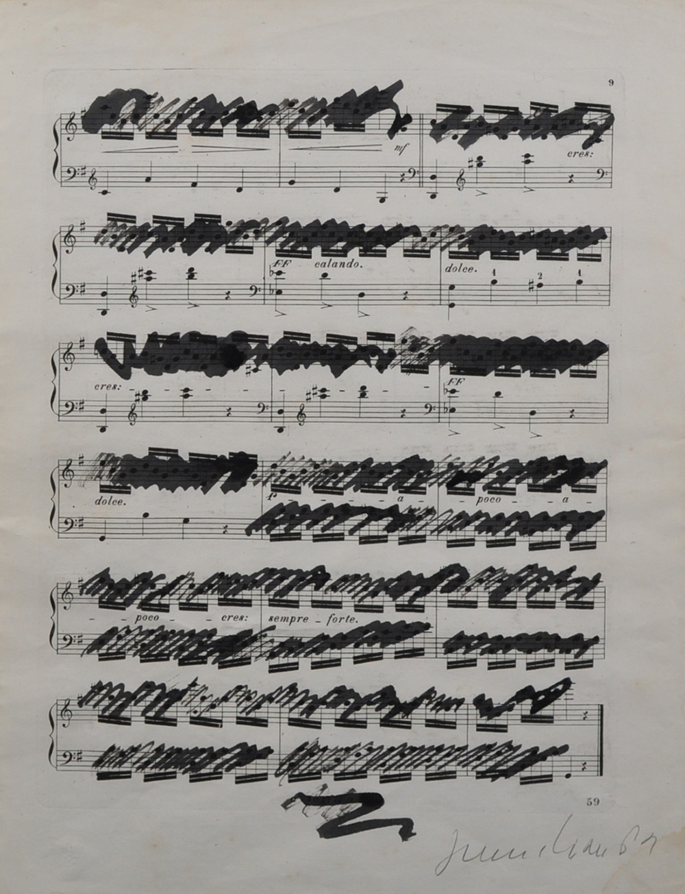GIUSEPPE CHIARI Senza titolo Tecnica mista su spartito musicale Anni 60 Dim. 35x26 Opera pubblicata su “Giuseppe Chiari – Musica madre” Firmato in basso