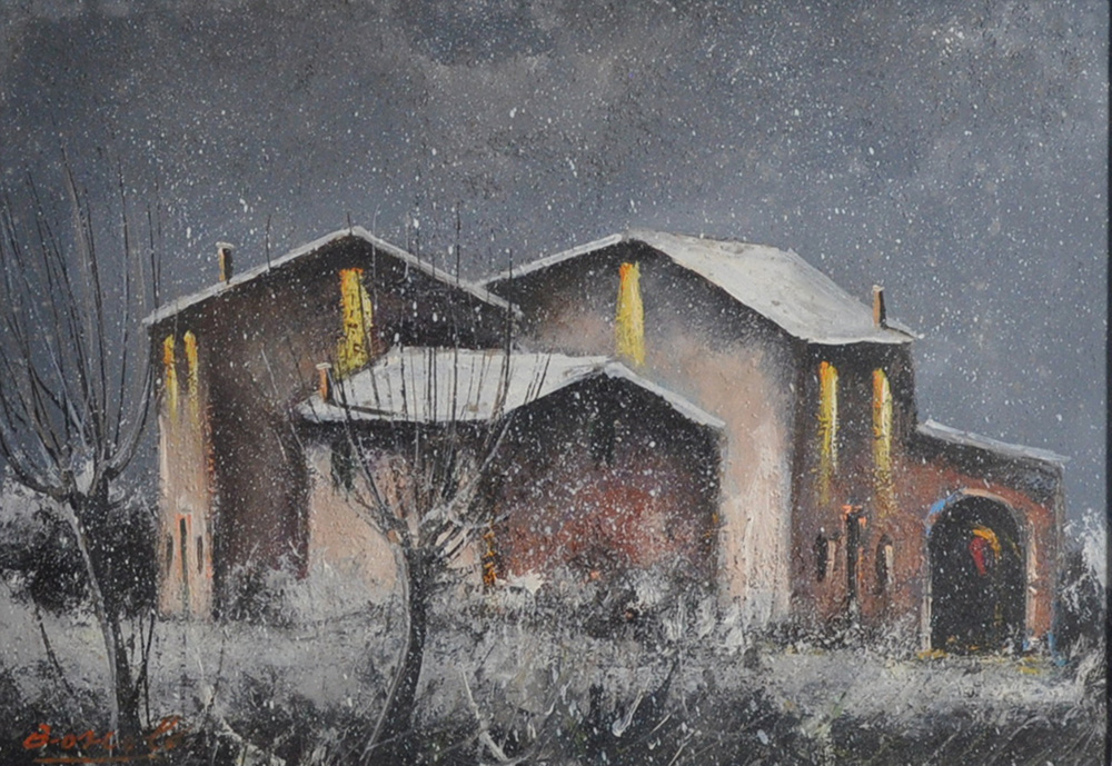 BOSCOLO Nevicata notturna Tecnica mista su masonite Anni 80 Dim. 30x40...