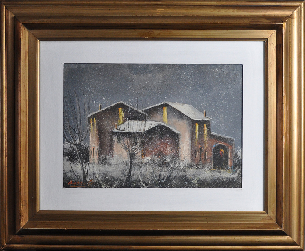 BOSCOLO Nevicata notturna Tecnica mista su masonite Anni 80 Dim. 30x40 Firmato in basso a sx