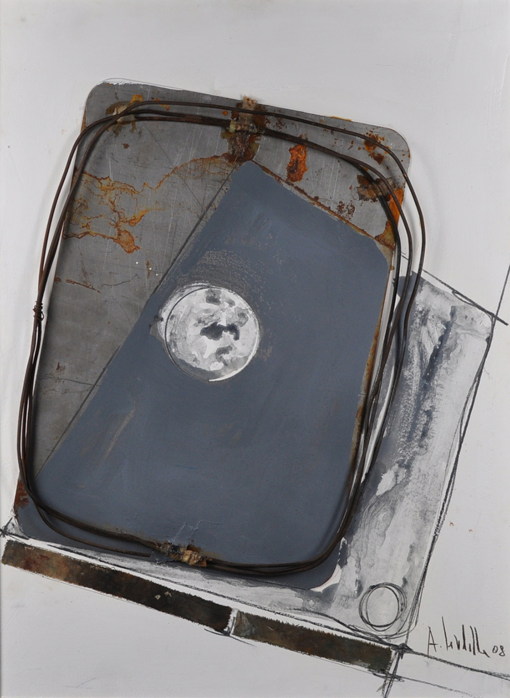 ANTONIO IEVOLELLA Senza titolo Tecnica mista e applicazioni di ferro su cartone Anno 2008 Dim. 75x55x4 Datato e firmato in basso a dx