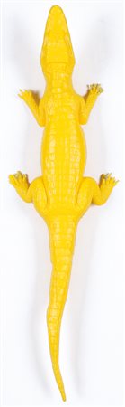 CRACKING ART Coccodrillo giallo scultura in materiale plastico con base in legno cm. 65x9x18, esemplare 3/200, timbro del Cracking Art Group sotto la base, timbro e firma per autenticità e provenienza della Galleria Il Bello dell'Arte (Rudiano-BS) su foto.