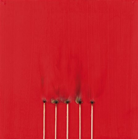 BERNARD AUBERTIN Fontenay aux Roses 1934 Dessin de feu, 2010 fiammiferi bruciati su tela cm. 35x35, firma al retro, dichiarazione d'autenticità dell'artista su foto, entro teca in plexiglass, pubblicato sul catalogo "Bernard Aubertin, sensorialità e trascendenza", edizioni Galleria d'Arte Rosenberg (MI), pagina 50.