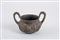 TAZZA BIANSATA DATAZIONE: VII sec. a. C. MATERIA E TECNICA: impasto depurato bruno rossiccio lucidato a stecca, modellata a tornio lento Tazza biansata con alto labbro impostato sulla vasca mediante una solcatura, vasca globulare schiacciata con umbone al centro e costolature in rilievo anse a nastro insellate, impostate verticalmente dall’orlo alla carena, fondo piatto PRODUZIONE: ceramica etrusca villanoviana STATO DI CONSERVAZIONE: ricomposta da frammenti DIMENSIONI: alt. cm 11; diam. cm 10 Il lotto, in base alla legge italiana, non è esportabile / This lot, according to Italian law, can not be exported