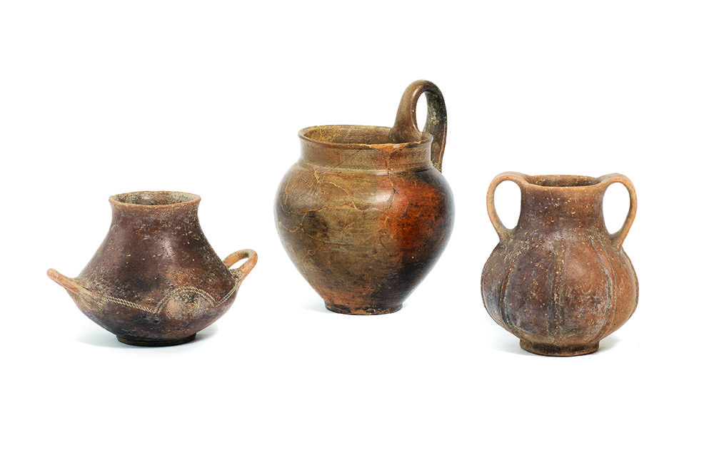 TRE VASI VILLANOVIANI DATAZIONE: fine VIII inizi VII sec. a. C. MATERIA E TECNICA: impasto depurato bruno lucidato a stecca, ingubbiatura rossiccia, decorazione ad impressione, modellati a mano e a tornio lento Grande attingitoio con orlo a colletto distinto dal corpo ovoide, piede a disco, alta ansa a nastro, sormontante, impostata verticalmente dall’orlo alla massima espansione, decorata sulla spalla con tre gruppi di solcature verticali equidistanti che formano un motivo metopale; anforetta con labbro leggermente estroflesso, collo cilindrico a profilo concavo, corpo lenticolare globoso, piede ad anello anse a nastro sormontanti, impostate dall’orlo alla spalla, decorata con costolature verticali in rilievo; olletta biansata con labbro leggermente estroflesso, collo cilindrico a profilo concavo indistinto dal corpo biconico, piede a disco, anse a bastoncello impostate obliquamente sulla carena, decorata con motivo a doppia cordicella che inquadra un’apofisi conica posta al centro di ciascun lato (3) PRODUZIONE: ceramica etrusca centro-meridionale STATO DI CONSERVAZIONE: due integri, una ricomposta da frammenti DIMENSIONI: alt. da cm. 19,7 a cm 11,8 PROVENIENZA: New Hermes Arte Antica, Arezzo Il lotto, in base alla legge italiana, non è esportabile / This lot, according to Italian law, can not be exported