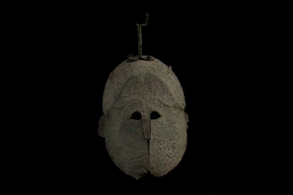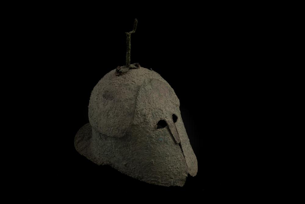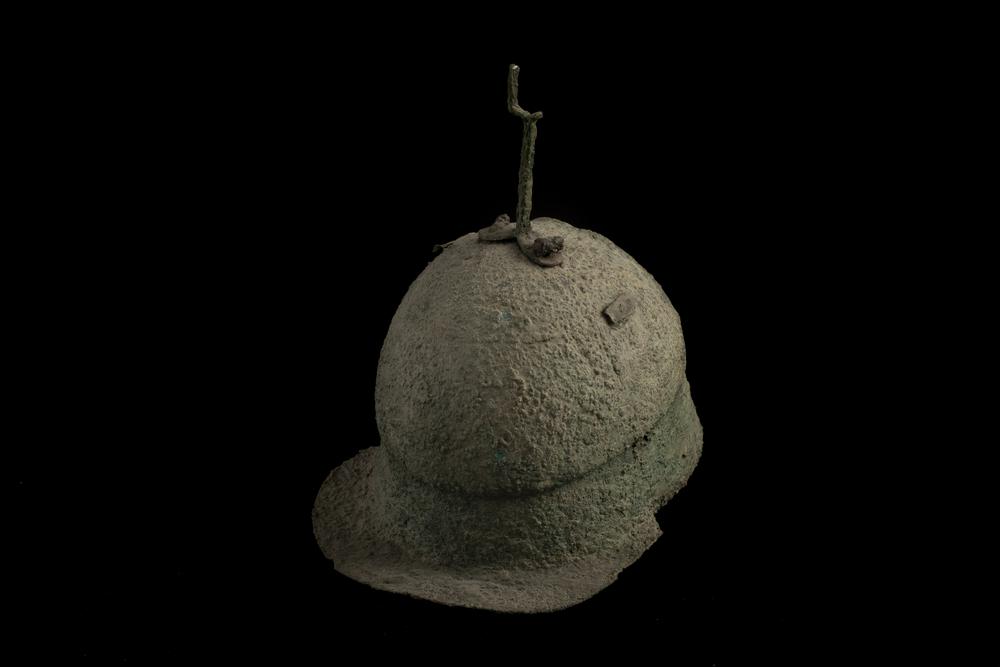 ELMO APULO CORINZIO IN BRONZO DATAZIONE: fine VI- inizi V sec. a.C. MATERIA E TECNICA: bronzo laminato e cesellato a bulino Calotta sferoidale, nuca distinta, falda rettilinea, fronte caratterizzata da sopracciglia rilevate; occhi forati, paranaso a ritaglio, paragnatidi separate e fisse. Alla sommità` della calotta, due linguette fissate con perni ribattuti sostengono un’antenna (lophos) per l’inserzione del cimiero PRODUZIONE: cultura apula-corinzia STATO DI CONSERVAZIONE: integro, ossidato, lievi interventi di restauro e consolidamento PROVENIENZA: Mutina Ars Antiqua, Modena DIMENSIONI: alt. cm 29, lungh. cm 31 CFR.: Gli elmi-apulo corinzi. Proposta di classificazione, in AnnAStorAnt 12, 1990, pagg. 23-37 Il lotto, in base alla legge italiana, non è esportabile / This lot, according to Italian law, can not be exported