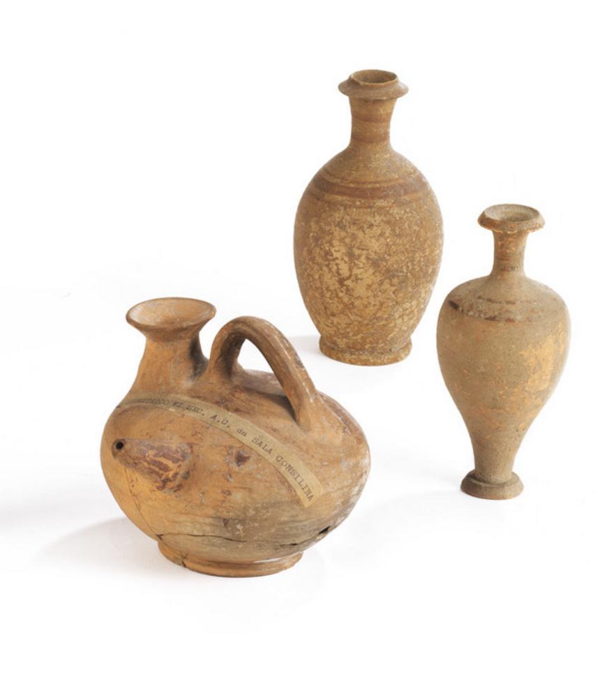 ASKOS E UNGUENTARI DATAZIONE: V-IV sec. a.C. MATERIA E TECNICA: argilla rosata, vernice bruna, modellati a tornio veloce Askos con bocchello circolare, ansa a nastro impostata verticalmente alla sommità, corpo lenticolare, beccuccio troncoconico, decorato a motivi geometrici; due unguentari dauni con alto collo e corpo piriforme decorati a fasce (3) PRODUZIONE: ceramica daunia STATO DI CONSERVAZIONE: integri gli unguentari, askos ricomposto da frammenti DIMENSIONI: alt. da cm 14,5 a cm 10 Il lotto, in base alla legge italiana, non è esportabile / This lot, according to Italian law, can not be exported