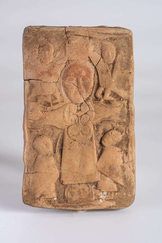 CROCIFISSIONE DATAZIONE: IX-XI sec. d. C. MATERIA E TECNICA: terracotta modellata a stampo Placca rettangolare raffigurante la Crocifissione in maniera stilizzata con una grande figura di Cristo a braccia aperte sulla croce sormontato da due angeli e con alla base due figure umane, probabilmente la Madonna e San Giovanni PRODUZIONE: cultura bizantina STATO DI CONSERVAZIONE: integra DIMENSIONI: cm 19,5x1