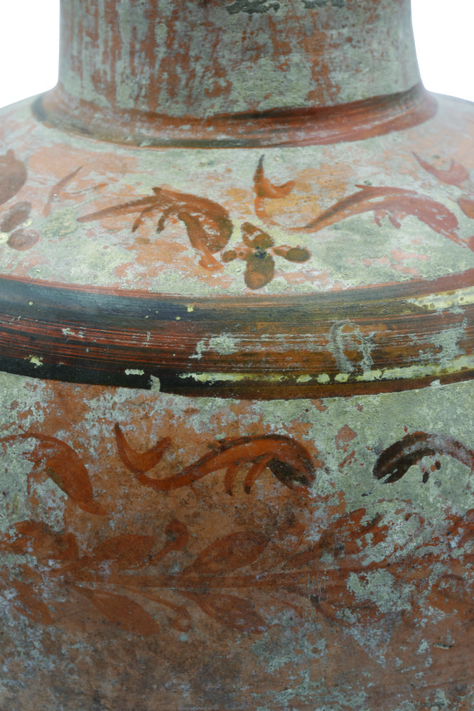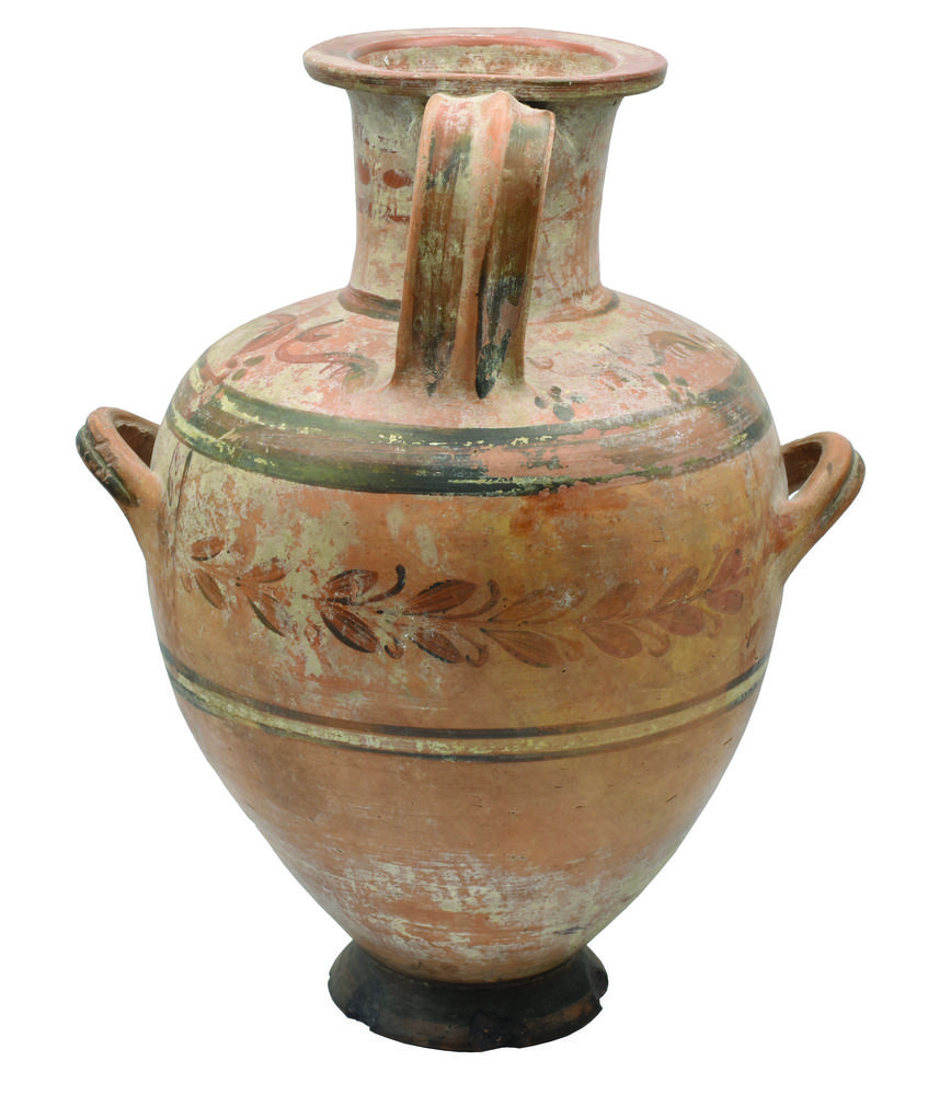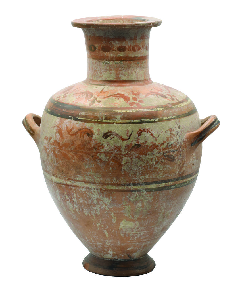 RARA HYDRIA ALESSANDRINA DATAZIONE: III-II sec. a. C. MATERIA E TECNICA: argilla figulina beige, ingubbiatura biancastra, suddipinture a vernice bruna; modellata a tornio veloce Hydria con orlo estroflesso ed appiattito, alto collo cilindrico a profilo concavo, distinto dalla spalla mediante una solcatura, corpo ovoide allungato verso il basso, piede troncoconico, anse a nastro costolato impostate una verticalmente dall’orlo alla spalla, le altre due obliquamente sulla massima espansione DECORAZIONE: fasce di vernice bruna sulla bocca, sulla parte esterna delle anse e del piede; sul collo fra due fasce decorazione a ovoli, sulla spalla fregio a delfini guizzanti verso destra e rosette a quattro petali; sul ventre, nello spazio fra le anse e delimitati da fasce brune in alto e in basso, si trovano nella parte anteriore delfini guizzanti e contrapposti sopra un grande ramo di olivo orizzontale, mentre nella parte posteriore solo il ramo di olivo PRODUZIONE: ceramica di Hadra STATO DI CONSERVAZIONE: integra, superficie incrostata DIMENSIONI: alt. cm 33,5 Il lotto è stato dichiarato di interesse archeologico particolarmente importante ai sensi del D.Lgs. 42/04 dal MiBACT in data 06 Maggio 2014. La ceramica di Hadra prende il nome dalla necropoli di Alessandria d’Egitto che ha restituito i primi e più numerosi esemplari; in realtà gli studi successivi hanno dimostrato che il centro di produzione di questa classe ceramica deve situarsi nell’isola di Creta. La manifattura ha prodotto principalmente hydriai ed è stata attiva fra il III ed il I sec. a. C. Il lotto, in base alla legge italiana, non è esportabile / This lot, according to Italian law, can not be exported