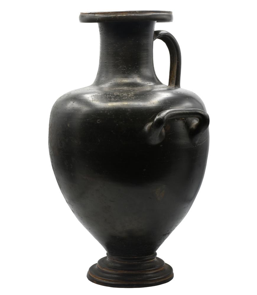 MONUMENTALE HYDRIA APULA A VERNICE NERA DATAZIONE: IV sec. a.C. MATERIA E TECNICA: argilla figulina rosata, vernice nera lucente, suddipinture in bianco e giallo, modellata a tornio veloce. Orlo a tesa appiattita con labbro pendulo obliquo, collo cilindrico a profilo concavo, a raccordo fluido con la spalla appiattita, corpo ovoide rastremato inferiormente, piede ad echino modanato, ansa posteriore a bastoncello, impostata dal collo alla spalla, anse laterali a bastoncello ritorte verso l’alto ed impostate obliquamente sul ventre PRODUZIONE: ceramica apula a vernice nera STATO DI CONSERVAZIONE: integralmente ricomposta da frammenti DIMENSIONI: alt. cm 44 Il lotto, in base alla legge italiana, non è esportabile / This lot, according to Italian law, can not be exported
