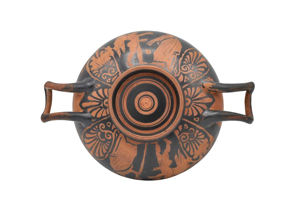 KYLIX ATTICA A FIGURE ROSSE DATAZIONE: fine V sec. a.C. MATERIA E TECNICA: argilla figulina rosata; vernice nera lucente con riflessi metallici, suddipinture in bianco, modellata a tornio veloce Kylix con labbro arrotondato, vasca troncoconica, basso piede cilindrico modanato, anse a bastoncello impostate obliquamente sotto l’orlo e ritorte verso l’alto DECORAZIONE ACCESSORIA: interamente verniciata ad eccezione dell’interno delle anse e del fondo del piede; sotto le anse palmette aperte a ventaglio fra girali e ulteriori palmette;sotto al piede fasce concentriche e punto al centro DECORAZIONE: interno della vasca decorato con elegante tralcio orizzontale di foglie d’edera cuoriformi e corimbi; nel tondo centrale scena di corteggiamento fra un satiro ed una giovane donna riccamente abbigliata con chitone plissettato e ricamato, seduta su un masso, volta a destra e retrospiciente, tiene la mano sinistra sul grembo e l’altra sulla gamba; dietro a lei un giovane satiro nudo, con grande coda e tenia nei capelli le appoggia la mano destra sulla spalla; sul lato esterno su entrambi i lati, scena di offerta: un erote nudo, con le ali chiuse sulla schiena è in atto di offrire qualcosa ad una donna di fronte a lui completamente avvolta nell’himation plissettato e ricamato PRODUZIONE: ceramica attica a figure rosse STATO DI CONSERVAZIONE: integra DIMENSIONI: alt. cm 5; diam. cm 17 Il lotto, in base alla legge italiana, non è esportabile / This lot, according to Italian law, can not be exported