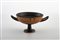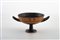 KYLIX ATTICA A FIGURE NERE DATAZIONE: 540-530 a.C. MATERIA E TECNICA: argilla figulina arancio; vernice nera lucente, suddipinture in bianco e paonazzo, dettagli resi a graffito, modellata a tornio veloce Forma tipo B, labbro con orlo arrotondato e lievemente estroflesso distinto dalla vasca troncoconica, alto piede a tromba, anse a bastoncello impostate obliquamente sotto al labbro DECORAZIONE ACCESSORIA: interamente verniciata, eccetto la parte interna delle anse, un filetto nella parte interna del labbro, altro filetto nella parte inferiore della vasca, il bordo esterno e la parte inferiore del piede; ai lati delle anse due girali con palmette aperte DECORAZIONE: all’esterno su entrambi i lati sul labbro coppia di danzatori nudi e affrontati, sulla vasca falsa iscrizione; all’interno tondo risparmiato con gorgoneion STATO DI CONSERVAZIONE: ricomposta da frammenti, con tracce di un restauro antico PRODUZIONE: ceramica attica a figure nere, Gruppo dei Piccoli Maestri DIMENSIONI: alt. cm 8,5; diam. cm 13,5 CFR.: G. Boardman Vasi ateniesi a figure nere, Milano 1990, tav. 290,1-2, p.158 Il lotto, in base alla legge italiana, non è esportabile / This lot, according to Italian law, can not be exported