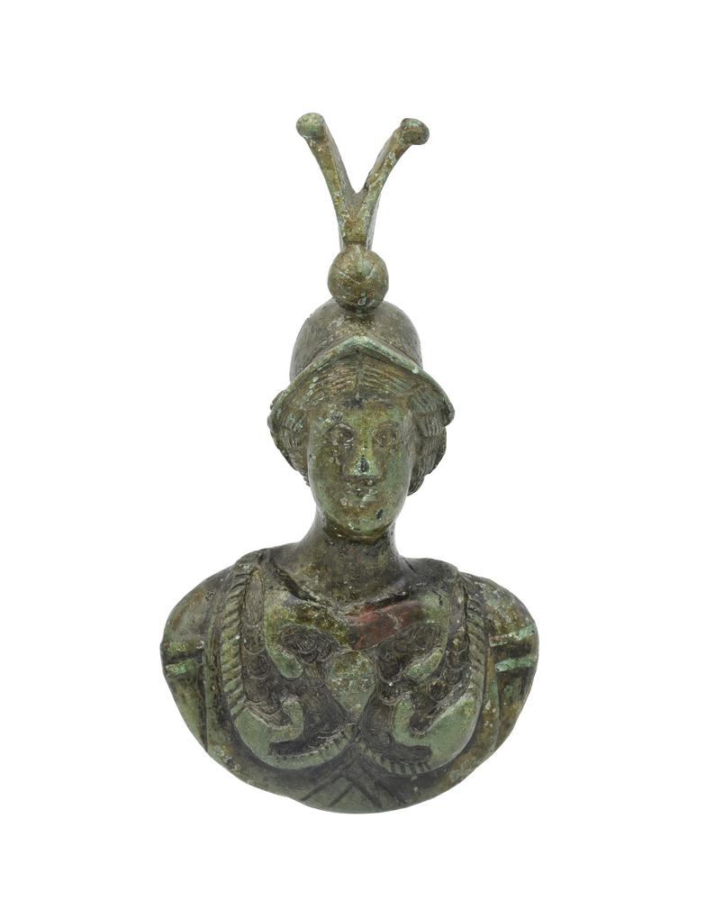 ATHENA DATAZIONE: II-III sec. d. C. MATERIA E TECNICA: bronzo a fusione piena cesellato Applique in forma di busto di Athena con elmo corinzio sollevato sulla testa e alto cimiero; capelli scompartiti sulla fronte, corazza e gorgoneion raffigurato come serpenti con il corpo a cordicella; il viso è raffigurato in modo semplificato con grandi occhi spalancati, naso largo e bocca sottile PRODUZIONE: cultura romana imperiale STATO DI CONSERVAZIONE: integro DIMENSIONI: alt. cm 12 PROVENIENZA: Gorny&Mosch, Munich CFR.: Bronzi antichi del Museo archeologico di Padova, Roma 2000 Il lotto, in base alla legge italiana, non è esportabile / This lot, according to Italian law, can not be exported