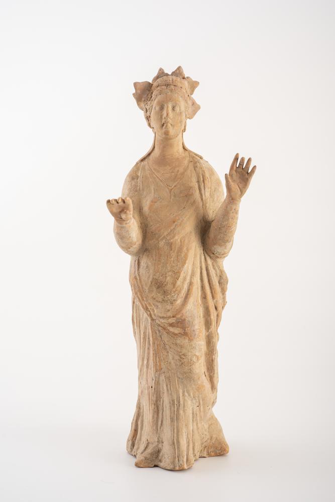 STATUETTA FEMMINILE DATAZIONE: III sec. a. C. MATERIA E TECNICA: argilla figulina rosata; modellata a stampo, con ritocchi a stecca, interno cavo, foro di sfiato posteriore Di dimensioni insolitamente grandi, la statuetta raffigura una giovane donna in atto di incedere in avanti con le braccia protese; sulla testa una corona di foglie di edera la qualifica come una baccante. Il volto pur nella resa semplificata restituisce l’espressione assorta; la donna indossa un chitone plissettato dal quale fuoriescono le punte delle scarpe e che lascia intravedere le forme; su questo e` drappeggiato l’himation PRODUZIONE: ceramica magnogreca STATO DI CONSERVAZIONE: testa ricomposta; parte delle mani e della corona di restauro DIMENSIONI: alt. cm 42,5 PROVENIENZA: Casa d’aste Pandolfini, 2016, Casa d’aste Gorny & Mosch, 2009 Il lotto, in base alla legge italiana, non è esportabile / This lot, according to Italian law, can not be exported