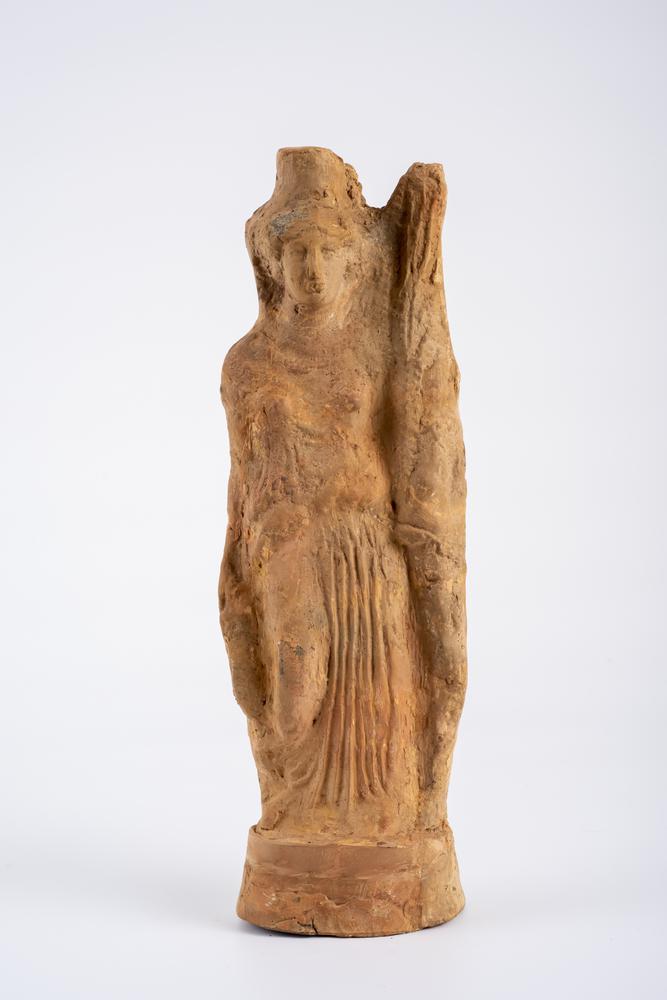 DEMETRA DATAZIONE: V-IV sec. a. C. MATERIA E TECNICA: argilla figulina rosata, modellata a stampo La grande statuetta raffigura la dea in posizione frontale, stante su base ellittica con alto polos sulla testa, col braccio destro steso lungo il fianco e il sinistro che si avvolge a una grande fiaccola, la gamba destra leggermente avanzata fuoriesce dal chitone plissettato; il volto della dea è giovane, con capelli ondulati che scendono a coprire la fronte, naso rettilineo e piccola bocca; parte posteriore non lavorata PRODUZIONE: ceramica siceliota STATO DI CONSERVAZIONE: ricomposta da frammenti con piccole lacune, matrice consunta DIMENSIONI: alt. cm 41 PROVENIENZA: Casa d’aste Pandolfini, 2009 Il lotto, in base alla legge italiana, non è esportabile / This lot, according to Italian law, can not be exported