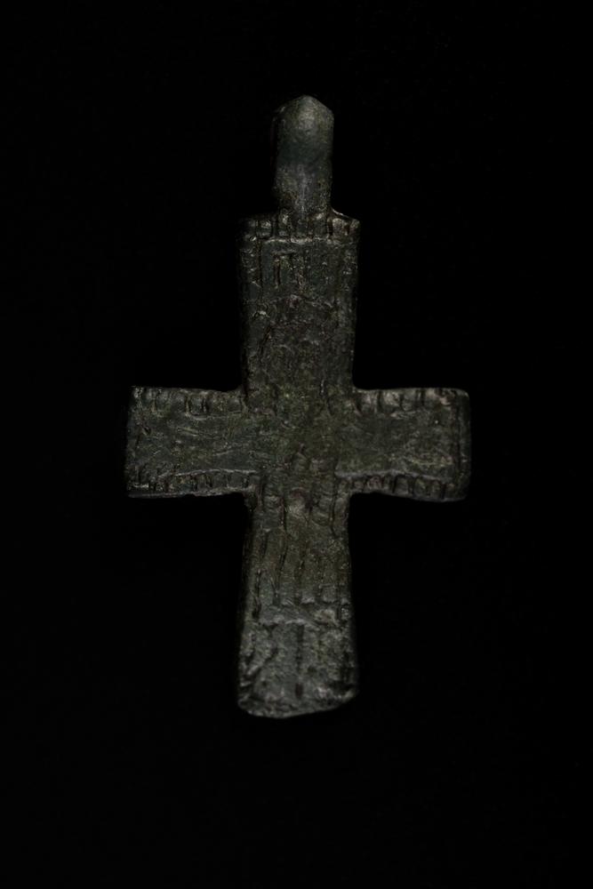 CROCE BIZANTINA DATAZIONE: IX-XI sec. d. C. MATERIA E TECNICA: bronzo fuso e cesellato Piccolo pendente modellato a croce greca con decoro perlinato lungo i bordi e figura di cristo crocefisso; anello di sospensione all’estremità superiore PRODUZIONE: cultura romana STATO DI CONSERVAZIONE: integro DIMENSIONI: lungh. cm 4 PROVENIENZA: Aesnumismaticus, Catawiki