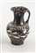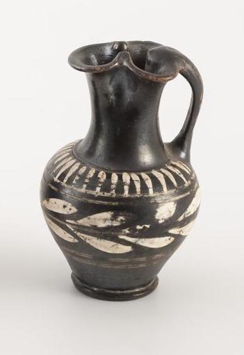 OINOCHOE NELLO STILE DI GNATHIA DATAZIONE: metà IV sec. a. C. MATERIA E TECNICA: argilla figulina rosata; vernice nera lucente, suddipintura bianca; modellata a tornio veloce Piccola oinochoe a bocca trilobata pronunciata da due apicature, alto collo troncoconico a profilo concavo distinto dal corpo ovoide, piede ad anello, ansa a nastro impostata verticalmente dall’orlo alla spalla DECORAZIONE: sulla spalla falsa baccellatura, sul ventre grande ramo di olivo orizzontale fra due coppie di linee PRODUZIONE: ceramica apula nello stile di Gnathia STATO DI CONSERVAZIONE: integra PROVENIENZA: Kunst und Munzen AG, Lugano, 1991 DIMENSIONI: alt. cm 11 Il lotto, in base alla legge italiana, non è esportabile / This lot, according to Italian law, can not be exported