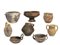 OTTO VASI VILLANOVIANI DATAZIONE: fine VIII inizi VII sec. a. C. MATERIA E TECNICA: impasto depurato bruno lucidato a stecca, decorazione ad impressione, modellati a mano e a tornio lento Attingitoio con vasca troncoconica, alta ansa a nastro, insellata e cornuta, sormontante, impostata verticalmente dall’orlo alla base, fondo piatto, coppa biansata con labbro leggermente estroflesso, alto labbro svasato, vasca troncoconica, anse a nastro sormontanti, impostate dall’orlo alla carena, calice su alto piede con vasca troncoconica e alto labbro, impostato sulla vasca mediante una risega, e decorato con tre solcature parallele impresse, ampio piede a tromba, anforetta con labbro estroflesso, collo cilindrico decorato a solcature, corpo ovoide, fondo piatto, anse a bastoncello verticali, due brocchette monoansate, una biconica, l’altra ovoide, fondo piatto, due ollette una con orlo estroflesso e corpo ovoide, l’altra troncoconica con labbro leggermente rientrante e quattro piccole anse a presa, entrambe con fondo piatto (8) PRODUZIONE: ceramica etrusca centro-meridionale STATO DI CONSERVAZIONE: cinque integri, tre ricomposti da frammenti DIMENSIONI: alt. da cm. 13 a cm 7 PROVENIENZA: Bertolami Fine Arts, Roma Il lotto, in base alla legge italiana, non è esportabile / This lot, according to Italian law, can not be exported