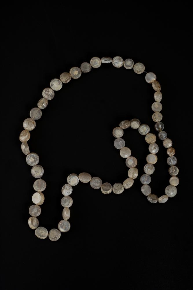 COLLANA IN AGATA DATAZIONE: II millennio a. C. MATERIA E TECNICA: agata calcedonio scolpita e levigata Lunghissima collana composta da vaghi troncoconici con base circolare piatta e faccia superiore convessa, di dimensioni digradanti PRODUZIONE: cultura sumera STATO DI CONSERVAZIONE: integra DIMENSIONI: lungh. cm 104 PROVENIENZA: Mutina Ars Antiqua, Modena