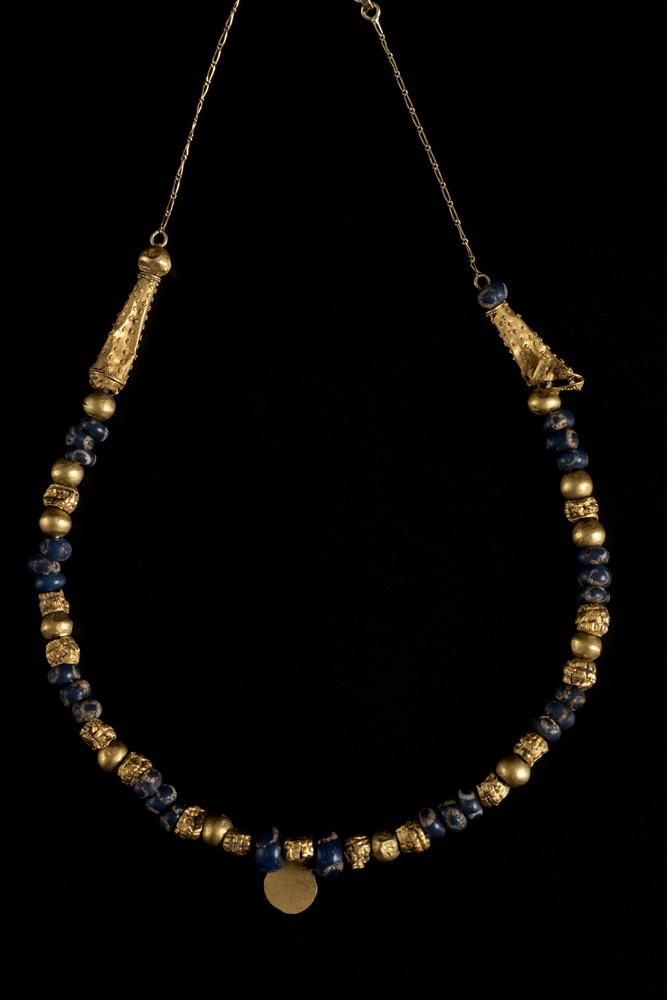 COLLANA IN PASTA VITREA DATAZIONE: III-II sec. a. C. MATERIA E TECNICA: pasta vitrea e lamina d’oro, decoro a granulazione Collana formata da tredici vaghi lisci e quindici vaghi decorati a granulazione in oro e due elementi cilindrici sempre a granulazione in oro e ventisette vaghi in pasta vitrea blu e bianca; al centro pendente circolare in lamina d’oro; chiusura moderna PRODUZIONE: cultura ellenistica STATO DI CONSERVAZIONE: integra, alcuni vaghi deformati PROVENIENZA: Frank Sternberg AG, Zurich, 1990 DIMENSIONI: oro gr. 8,46; lungh. cm 43 Il lotto, in base alla legge italiana, non è esportabile / This lot, according to Italian law, can not be exported