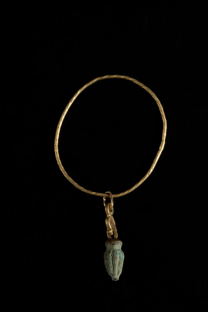 MONILE PUNICO-ROMANO DATAZIONE: III sec. d. C. MATERIA E TECNICA: verga d’oro lavorata a tortiglione e pietra calcarea scolpita Braccialetto circolare in oro ritorto al quale è appeso un pendente incalcare verde intagliato in forma di ghianda sostenuto da un elemento modellato a ferro di cavallo. La ghianda era considerata un portafortuna nella cultura punica PRODUZIONE: cultura punico-romana, Cartagine STATO DI CONSERVAZIONE: integro PROVENIENZA: Kunst und Munzen AG, Lugano, 1993 DIMENSIONI: oro gr. 8,46; diam. cm 5,8 Il lotto, in base alla legge italiana, non è esportabile / This lot, according to Italian law, can not be exported