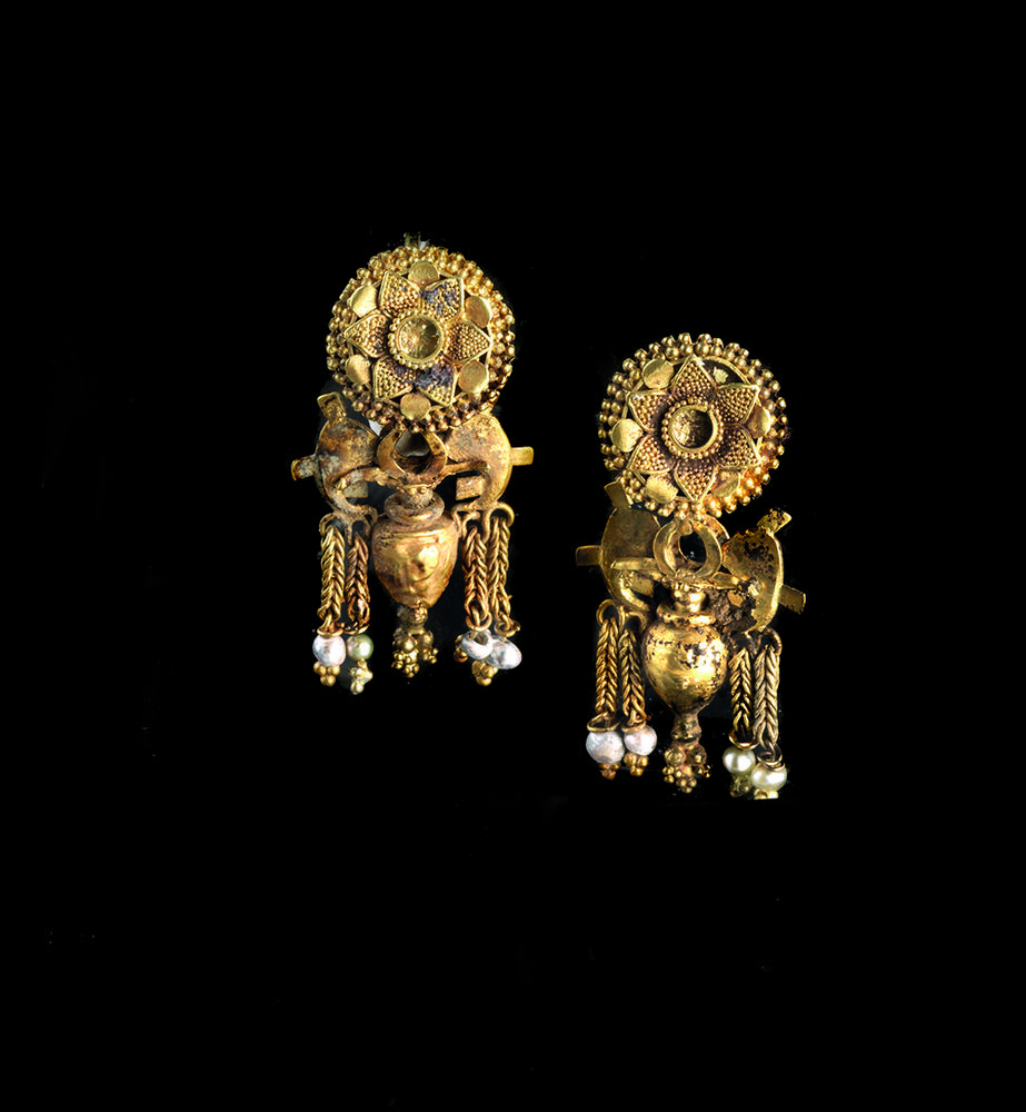 COPPIA DI ORECCHINI ROMANI IN ORO DATAZIONE: I sec. a. C.; I sec. d. C. MATERIA E TECNICA: oro in filo ed in lamina; granulazione e microperle Coppia di orecchini formati da un disco nella parte superiore abbellito con un motivo floreale a dodici petali con granulazione al quale è sospesa un’anforetta stilizzata dalle cui anse pendono quattro piccole catene in maglia tubolare desinenti in microperle. (2) PRODUZIONE: romana imperiale STATO DI CONSERVAZIONE: integri, incrostati, un piccolo petalo mancante DIMENSIONI: alt. cm 3,5 PESO: gr. 9 PROVENIENZA: Timeline Auctions, Inghilterra Il lotto, in base alla legge italiana, non è esportabile / This lot, according to Italian law, can not be exported