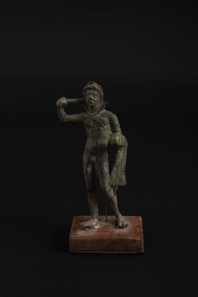 ERACLE DATAZIONE: IV sec. a. C. MATERIA E TECNICA: bronzo fuso e cesellato Statuetta che raffigura l’eroe in riposo, nudo, con la leontè sulla testa , annodata sul torace e terminante sull’avambraccio sinistro, il peso sula gamba destra, il braccio destro sollevato ad appoggiare la clava sulla spalla e la gamba sinistra flessa. PRODUZIONE: cultura etrusca STATO DI CONSERVAZIONE: integra, ossidata DIMENSIONI: alt. cm 19 PROVENIENZA: Marino Taini, Arte Primitivo, New York 2006 Il lotto, in base alla legge italiana, non è esportabile / This lot, according to Italian law, can not be exported