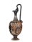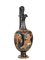 OINOCHOE APULA A FIGURE ROSSE DATAZIONE: ultimo quarto del IV sec. a. C MATERIA E TECNICA: argilla camoscio, vernice nera lucente; suddipinture in bianco e giallo e paonazzo, coloritura rosso arancio, modellata a tornio veloce Bocca trilobata pronunciata da due apicature con labbro rovesciato all’esterno e scanalato, alto collo a profilo concavo, distinto da una leggera solcatura alla base dal corpo ovoidale, ansa a nastro con triplice costolatura, sormontante, impostata verticalmente dal labbro alla spalla; piede scanalato DECORAZIONE ACCESSORIA: interamente verniciata in nero; sul collo kyma ionico e falsa baccellatura, sulla spalla teoria di rosette, sotto la scena figurata meandro interrotto sinistrorso; sotto l’ansa grande palmetta aperta a ventaglio fra girali, volute e infiorescenze, bordo del piede risparmiato; ai due attacchi superiore e inferiore dell’ansa protome femminile DECORAZIONE: scena di gineceo con grande figura femminile assisa a destra su un elegante sgabello e con i piedi appoggiati ad un suppedaneo; la giovane è retrospiciente e riccamente abbigliata con kekriphalos dal quale fuoriesce un ciuffo di capelli, stephane, orecchini e collana di perle, armille ai polsi e calzari e tiene un tirso nella mano destra ed un cembalo nell’altra; davanti a lei un erote androgino stante a sinistra; il giovane è raffigurato con grandi ali variopinte sollevate, capelli coperti dal kekripahlos, stephane radiata, collana di perle, una collana di perle a balteo sul petto, armille ai polsi e alle caviglie, in atto di offrire con la mano sinistra una tenia ricamata alla giovane donna; dietro alla figura centrale un altro erote androgino, nudo e volto a destra, abbigliato in modo analogo all’altro, tiene il piede destro su una pila di sassi e offre uno specchio alla giovane, mentre con l’altra mano tiene un festone di rosette PRODUZIONE: ceramica apula a figure rosse, bottega del Pittore di Baltimora STATO DI CONSERVAZIONE: integra DIMENSIONI: alt. cm 36,5 PROVENIENZA: New Hermes Arte Antica, Arezzo CFR: A.D. Trendall, A. Cambitoglou The Red-figured Vases of Apulia, Supplemento II, London 1991, n. 27/177b Il lotto, in base alla legge italiana, non è esportabile / This lot, according to Italian law, can not be exported