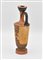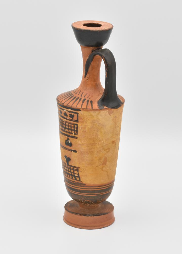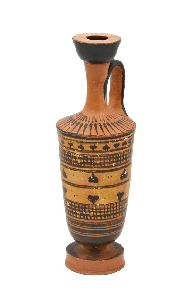 LEKYTHOS ATTICA A FIGURE NERE DATAZIONE: V sec. a.C. MATERIA E TECNICA: argilla figulina arancio, vernice nera lucente; modellata a tornio veloce Bocchello di forma troncoconica rovescia, sottile collo cilindrico a profilo concavo, indistinto dalla spalla obliqua, corpo ovoide allungato; ansa a nastro impostata verticalmente dal collo alla spalla, piede ad echino DECORAZIONE: bocchello e ansa verniciati, spalla con trattini e linguette radiali; parte inferiore del corpo e superiore del piede verniciati; sotto la spalla tralcio di piccole fogle d’edera; ventre decorato al centro con tralcio doppio di foglie d’edera cuoriformi inquadrato fra due fasce a griglia PRODUZIONE: ceramica attica a vernice nera STATO DI CONSERVAZIONE: integra, ad eccezione di un restauro sul collo DIMENSIONI: alt. cm 19,8 PROVENIENZA: Benson Foundation Ltd., Dublino Il lotto, in base alla legge italiana, non è esportabile / This lot, according to Italian law, can not be exported