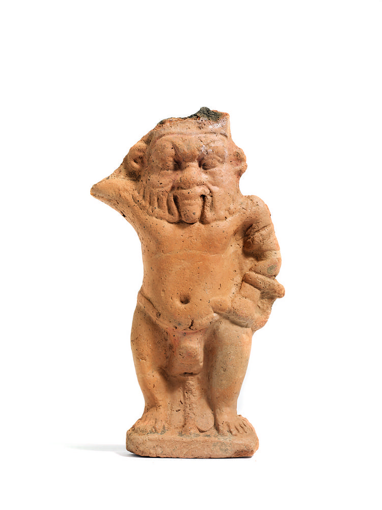 BES DATAZIONE: Epoca Tarda 716-30 a C. MATERIA E TECNICA: impasto ricco di inclusi, ingubbiatura rosata, modellato a stampo con ritocchi a stecca Statuetta del dio Bes raffigurato nudo col sesso in evidenza, folta capigliatura, occhi globosi, naso schiacciato, bocca semiaperta con i denti evidenziati e da cui fuoriesce la lingua, lunga barba e grandi orecchie sporgenti. Il dio ha il braccio destro, oggi mancante, sollevato ed il sinistro sul fianco; sul braccio è avvolto un serpente PRODUZIONE: ceramica egiziana STATO DI CONSERVAZIONE: braccio destro e parte della capigliatura lacunosi; ricomposto da due frammenti DIMENSIONI: alt cm 30 A.A.V.V. Voyage en Egypte, esposizione al Musee de Prehistoire regionale de Menton, 1990 PROVENIENZA: Collezione di Anatole France, Hotel de Ventes de Montecarlo, Monaco