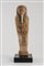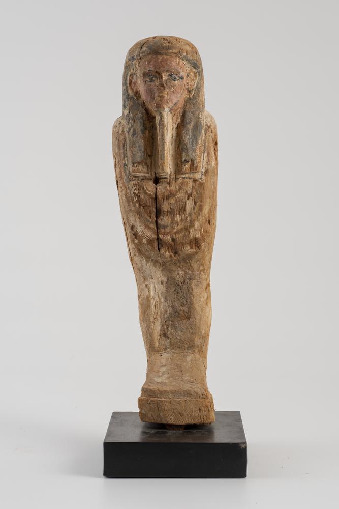 PTAH SOKAR OSIRIS DATAZIONE: Epoca Tolemaica 332-30 a.C. MATERIA E TECNICA: legno intagliato, stuccato e dipinto in bianco, nero, ocra, azzurro e rosso Grande figura maschile mummiforme, completamente avvolta dalle bende che rivelano il modellato anatomico e da cui fuoriesce la testa coperta una lunga parrucca tripartita. Il volto è regolare con occhi grandi, naso diritto, piccola bocca e zigomi lievemente sporgenti; dal mento parte una lunga barba posticcia. Il torace è quasi completamente coperto da un grande collare usekh a più giri di elementi colorati; i piedi poggiano su una base trapezoidale. Nella parte inferiore si conserva un tenone ligneo per l’inserimento in un basamento oggi perduto. PRODUZIONE: cultura egiziana tolemaica STATO DI CONSERVAZIONE: integra, alcune fenditure, tracce di insetti xilofagi DIMENSIONI: alt. cm 41 CORREDATA DA ATTESTATO DI LIBERA CIRCOLAZIONE