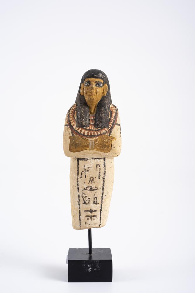 RARO USHABTI CALCAREO DATAZIONE: Nuovo Regno MATERIA E TECNICA: calcare bianco scolpito, vernice nera, ocra e rossa Figura mummiforme, stante frontalmente, con parrucca tripartita, coperta dal fazzoletto nemes, collana usekh a quattro giri; tratti del viso sommariamente definiti; braccia incrociate sul petto a sostenere una zappa in ciascuna mano; sulle gambe iscrizione geroglifica dipinta su colonna verticale. Sulla schiena pilastro dorsale. PRODUZIONE: cultura egiziana STATO DI CONSERVAZIONE: integro DIMENSIONI: alt. cm 14,5