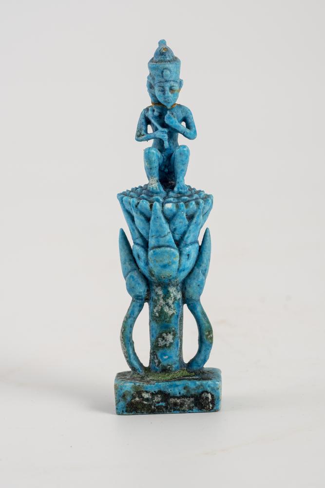 HORUS BAMBINO DATAZIONE: Periodo Tardo, 711-30 a. C. MATERIA E TECNICA: faience egiziana azzurra, modellato a stampo Statuetta del dio Horus bambino seduto su un grande fior di loto semiaperto; il dio è raffigurato come sovrano dell’Egitto con la doppia corona sulla testa e i due scettri del paese nelle mani. PRODUZIONE: cultura egiziana STATO DI CONSERVAZIONE: integro DIMENSIONI: alt. cm 4 PROVENIENZA: La Miniera, Desio, MI; New Hermes, Arezzo