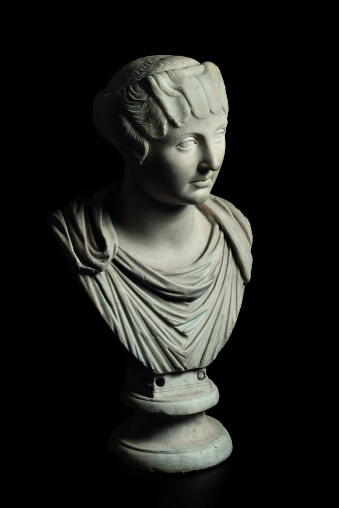 FAUSTINA MINORE DATAZIONE: seconda metà II sec. d.C. MATERIA E TECNICA: marmo bianco a grana fine scolpito e levigato Il busto raffigura l'imperatrice con la testa lievemente volta a sinistra e lo sguardo avanti a sé. La donna porta una complicata acconciatura di capelli che ricade in onde verticali sovrapposte sulla fronte e sulle tempie fino a coprire le orecchie e forma un elaborato chignon sulla nuca mentre il resto è trattato con un semplice motivo ondulato. Il volto è caratterizzato da una fronte ampia, dalla resa delle sopracciglia mediante piccole incisioni, gli occhi sono chiaroscurati con indicazioni della palpebra, del dotto lacrimale e della pupilla con l’iride. Il naso è rettilineo e gli zigomi sono leggermente pronunciati, la bocca è piccola e carnosa e il mento in evidenza. Sul collo si percepisce la muscolatura sotto la pelle; sulle spalle è drappeggiato il mantello che ricade in pieghe metalliche sul petto; base modanata circolare PRODUZIONE: romano imperiale STATO DI CONSERVAZIONE: testa integralmente ricomposta da frammenti, rilavorazioni posteriori DIMENSIONI: alt. cm 67 PROVENIENZA: Casa d’Aste Pandolfini, 2015 Annia Galeria Faustina, detta Faustina Minore 130 circa - 175 d. C. figlia di Antonino Pio e Faustina Maggiore e madre dell'imperatore Commodo; sposò nel 145 Marco Aurelio, suo cugino, che seguì in numerose campagne militari tanto da essere chiamata mater castrorum. Morì a Halala, successivamente chiamata Faustinopoli, in Cappadocia, dove aveva seguito il marito per sedare la ribellione di Avidio Cassio. Fu divinizzata, e in suo onore furono istituiti collegi di sacerdotesse. L'acconciatura raffigurata su questo busto fu creata appositamente per festeggiare la nascita dei gemelli Commodo e Fulvio Antonino nel 161 d. C. Il busto trova confronti precisi con quello conservato presso i Musei Capitolini a Roma, n. inv. MC 0449 Il lotto, in base alla legge italiana, non è esportabile / This lot, according to Italian law, can not be exported