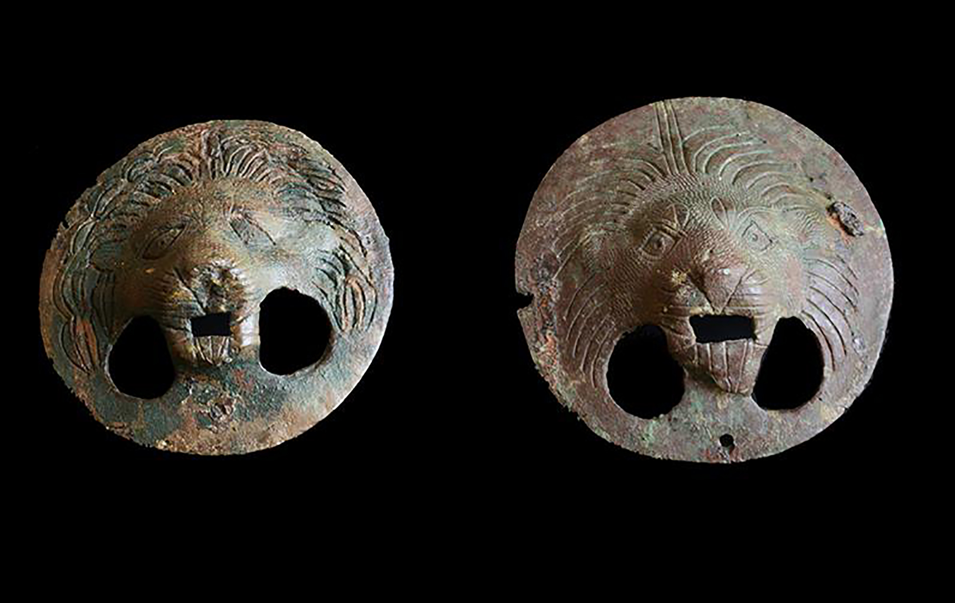 Due grandi borchie circolari modellate come una testa di leone con le fauci spalancate e la criniera realisticamente realizzata mediante sottili incisioni, probabilmente parti di maniglie di porta o cassa