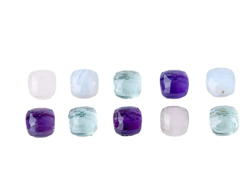 LOTTO DI DIECI PIETRE SEMI-PREZIOSE PER CT 83 CIRCA di forma quadrata, taglio misto, mm 10,51x10,49x10,05 LOT OF TEN SEMI-PRECIOUS STONES