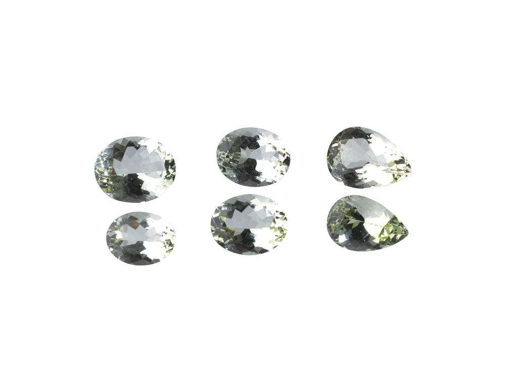 LOTTO DI SEI BERILLI PER CT 14.56 di cui quattro di forma ovale e due a goccia, taglio composito, mm 9,06x7,11x4,67 il più piccolo, 11,04x9,05x5,11 il più grande. LOT OF SIX BERYLS