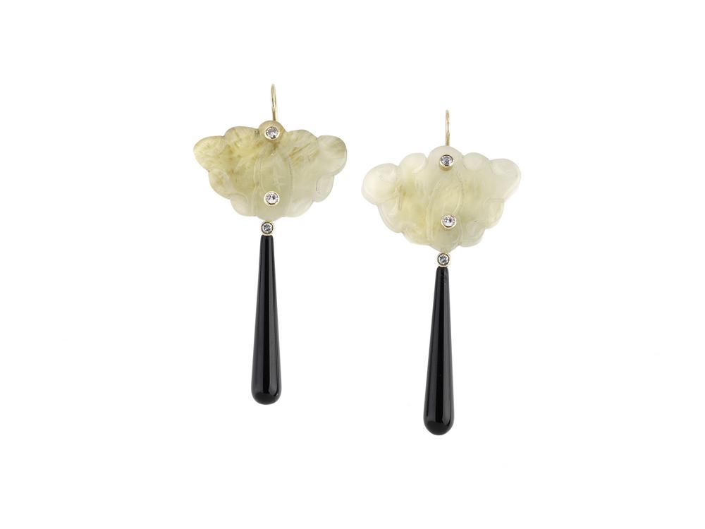 PAIO DI ORECCHINI PENDENTI IN ORO, NEFRITI, ONICE E DIAMANTI ciascuno...