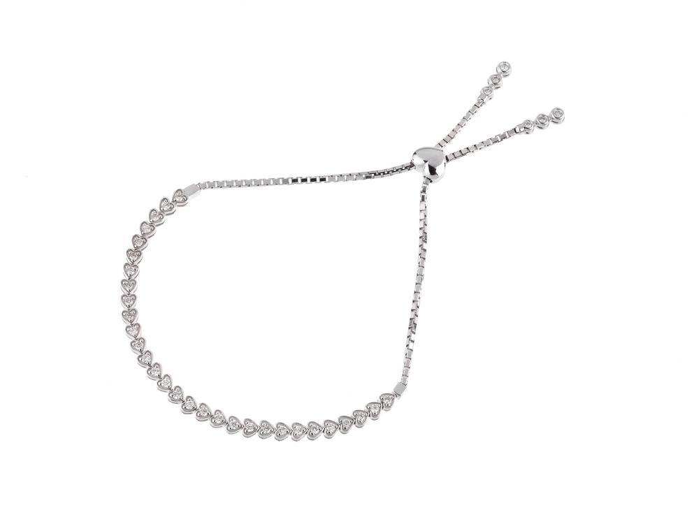 BRACCIALE IN ORO BIANCO E DIAMANTI montatura con chiusura scorrevole modellata a cuore ad una linea di diamanti taglio brillante rotondo montati entro castoni a cuore, finali a maglia sottile decorati da diamanti montati entro castoni rotondi per complessivi ct 0,60 circa, diametro max cm 6,5 circa, g 6 circa WHITE GOLD AND DIAMOND BRACELET