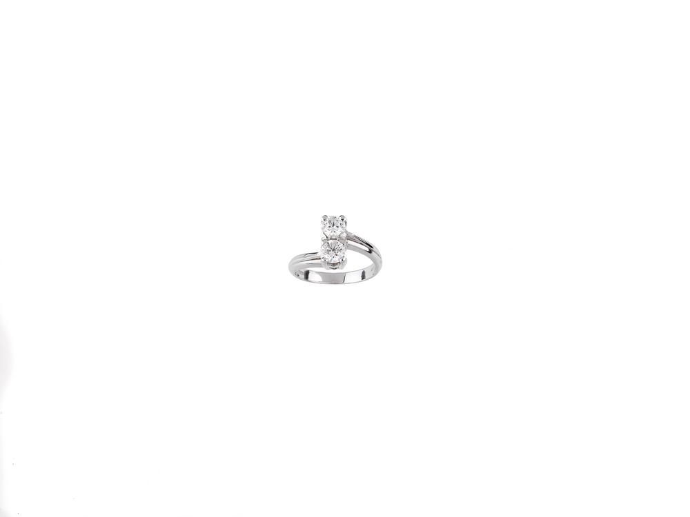 ANELLO IN ORO BIANCO E DIAMANTI montatura contrarié decorata da due diamanti taglio brillante per ct 1.00 totali circa, colore G-H, purezza SI, posti in linea entro castoni a griffes, punzone 750, misura 13,5, g 6 circa DIAMOND AND WHITE GOLD RING