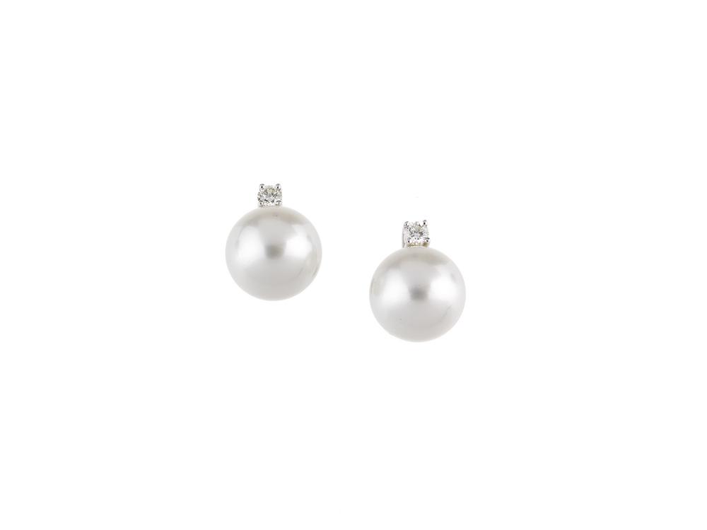 PAIO DI ORECCHINI IN ORO BIANCO, PERLE AUSTRALIANE E DIAMANTI ciascuno realizzato con una perla coltivata australiana diametro mm 13.8 sormontata da un diamante taglio brillante rotondo per ct 0.40 totali circa, punzone 750, g 10,6 circa SOUTH SEA PEARL, DIAMOND AND WHITE GOLD EARRINGS
