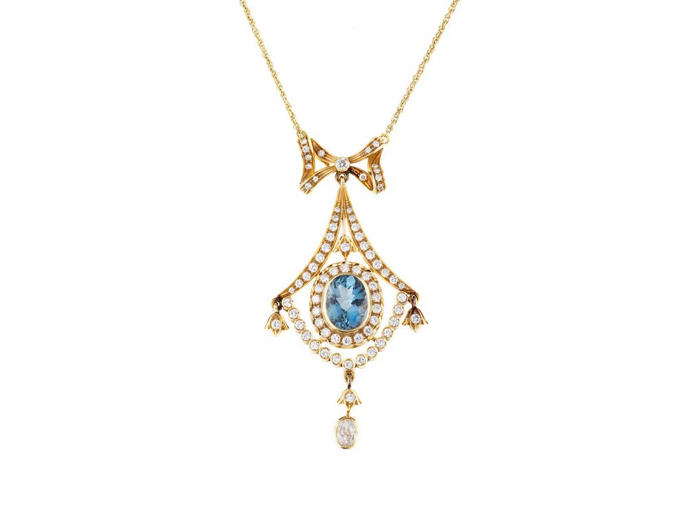 disegnato come un fiocco a cui è sospeso un elemento traforato e centrato da un’acquamarina di ct 3.50 circa, il tutto decorato da diamanti taglio brillante per ct 2.00 circa, corredato di catena a maglia sottile, dimensioni 6,5 x 3, punzoni 750, g 15,5