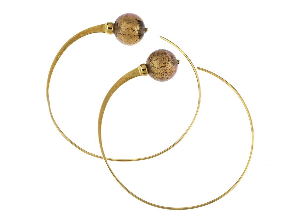 a cerchio sottile, decorati all’estremità da una sferetta in pasta vitrea, punzone 750, diametro cm 6, g 10 circa