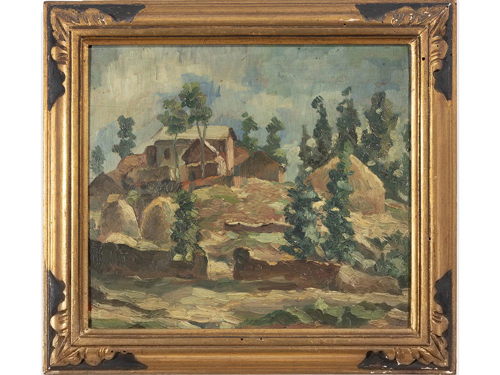 Anonimo (XX secolo) Paesaggio con casa e covoni 24x28 cm Olio su compensato