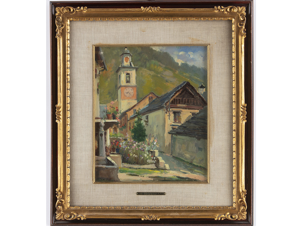 Tullio Giovenzani (1907-1975) Scorcio di paese montano con campanile 30x25 cm Olio su compensato
