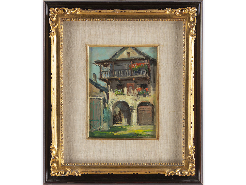 Tullio Giovenzani (1907-1975) Casolare con balcone fiorito 20x15,5 cm Olio su cartoncino