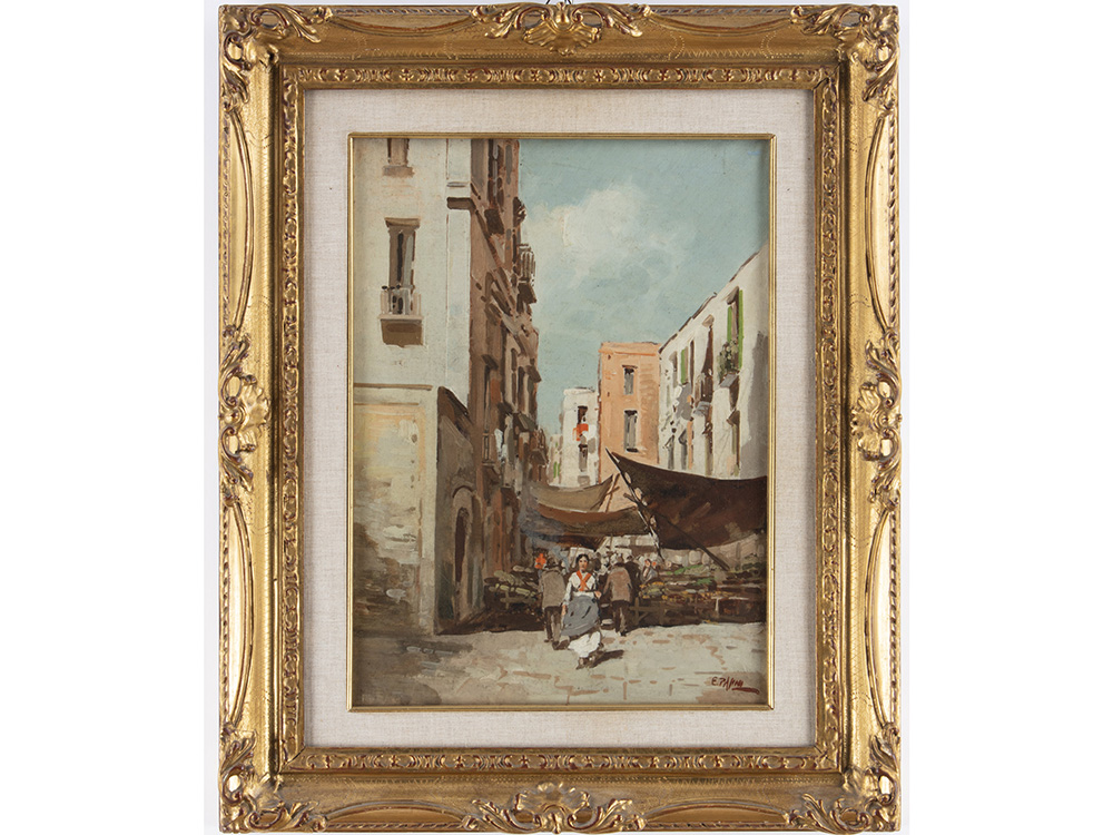 E.Pasini (XX secolo) Vicolo con figure 39,3x29 cm Olio su tela