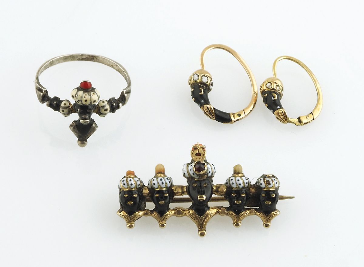 Demi parure in oro giallo ed argento con moretti composta da spilla orecchini monachella ed anello. Seconda metà '800